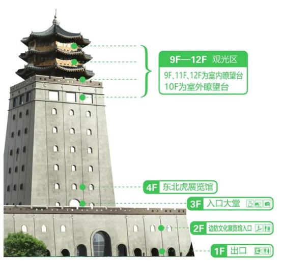 龙虎阁顶部为仿古样式,主体为堡垒样式设计。龙虎阁共12层,阁中有两大主题展区—【边防文化展览馆】&【东北虎展览馆】。