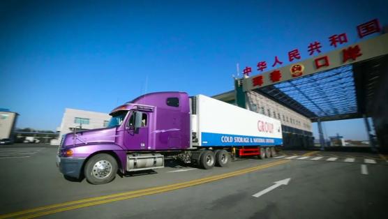 写着俄文的卡车满载帝王蟹、鳕鱼等海鲜