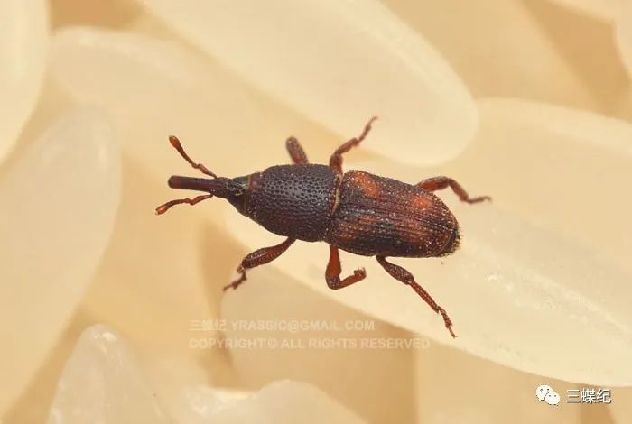 在我们吃的大米里就有一种小甲虫,叫作米象,在分类上属于昆虫纲鞘翅目象甲科米象属。在过去,大米并不像现在这样有真空包装,所以米在米缸里放久了就会有米象跑出来。现在,如果买散装大米久置在家也会见到。