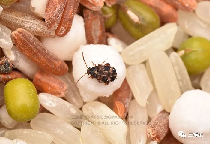 和米象类似的是豆象,这是一类喜欢吃豆子的小甲虫,很多种类都在野外,但是有一部分种类进入了粮仓。雌性豆象把卵产在豆子里面,幼虫孵化后就吃这粒豆子。豆象繁殖能力很强,在温度高的地方几乎全年都能繁殖。如果家里有放了很久的红豆、绿豆,就可能会看到豆象出现在家里。