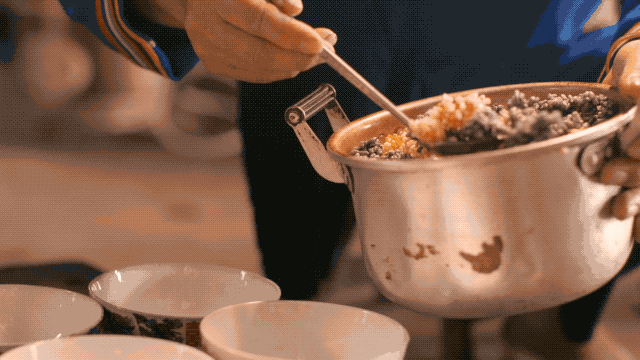 油茶汤可以单独喝,也可以加入各式辅料——黄豆、花生、糖果果。老人们最懂喝油茶汤的技巧,不用餐具就能连汤带茶叶嘬入口中。油炸后的茶叶芳香酥脆,也不腻口。