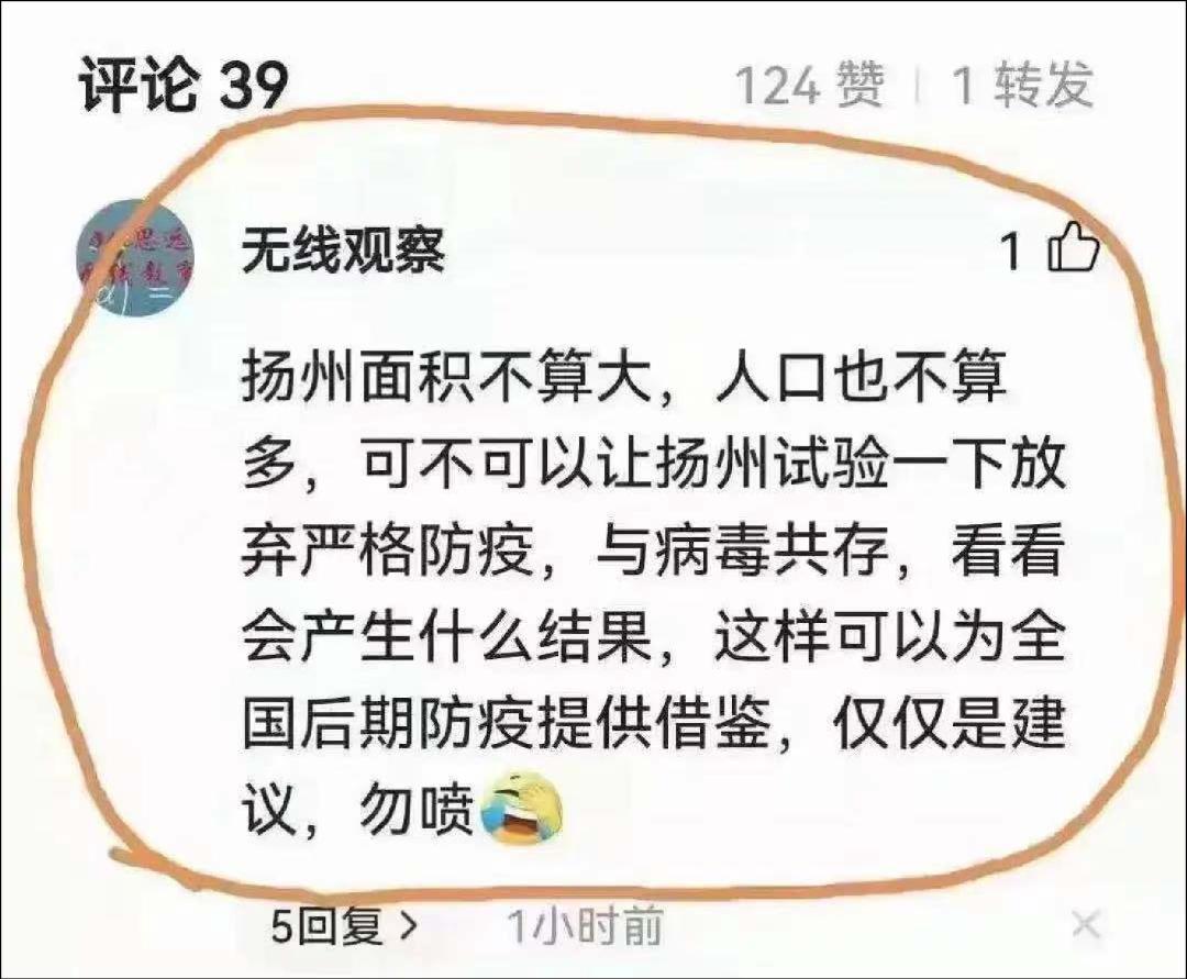 网传截图显示,“无线观察”此前在今日头条一文章的评论区留言称,“扬州面积不算大,人口也不算多,可不可以让扬州试验一下放弃严格防疫,与病毒共存,看看会产生什么结果,这样可以为全国后期防疫提供借鉴,仅仅是建议,勿喷。”