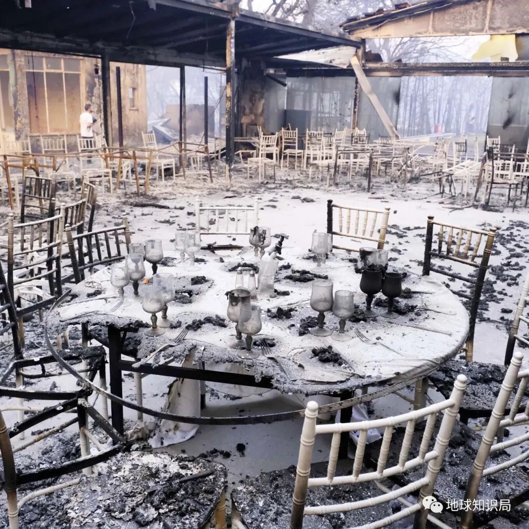 持续多日的火灾把大量烟尘排入空气,为受灾地区带来严重的空气污染,天空一片昏黄。天空下被熏黑的空荡房屋与仅剩根部的碳化树木一起构成了末世般的景象。这边火刚灭掉,另一边又烧起来了