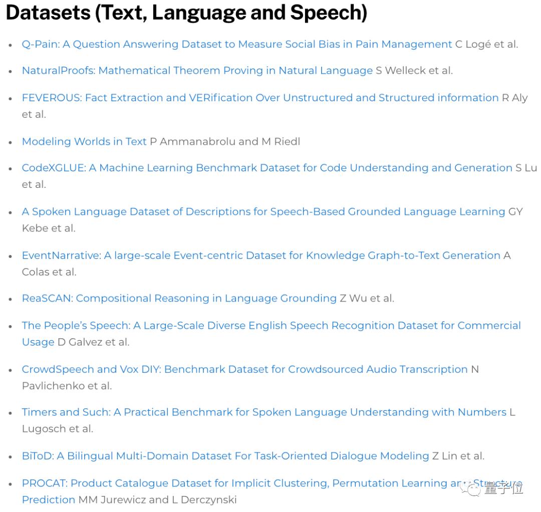 主要为文本、语言、语音类的NLP数据集方向则有13篇: