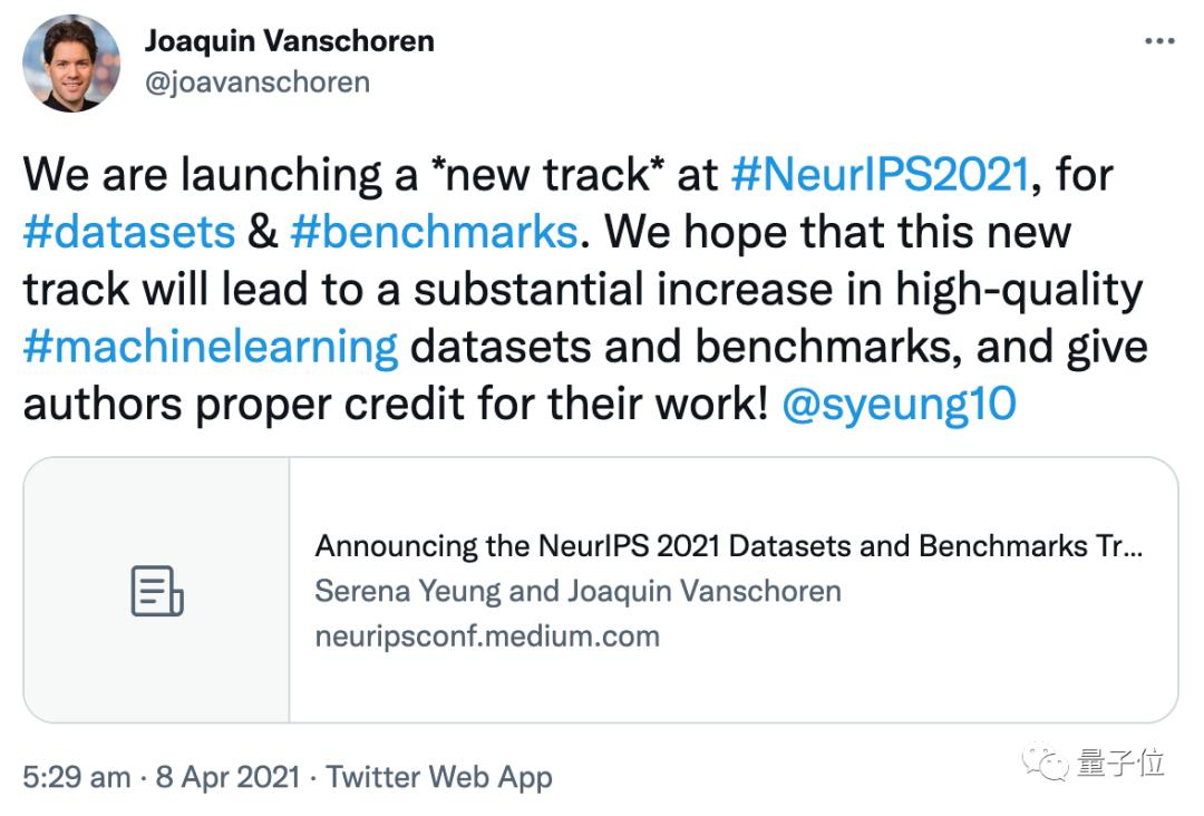 数据集和基准也需要审查规则这一新Track是今年4月份,由NeurIPS的数据&基准主席Joaquin Vanschoren宣布的: