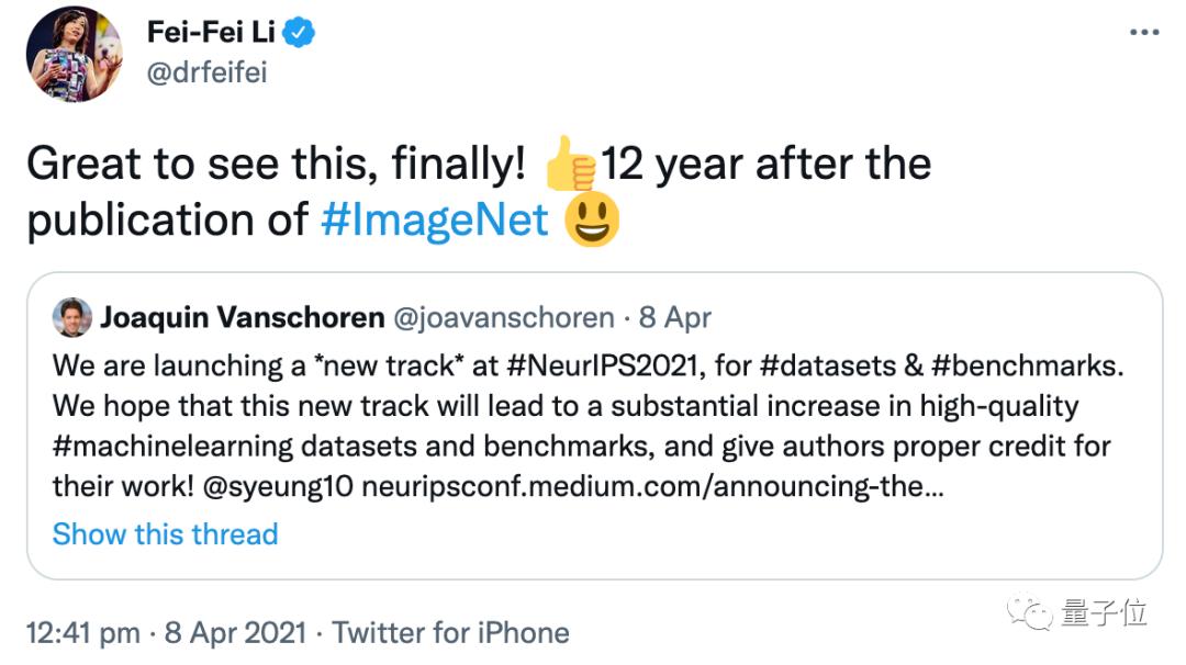 消息发出后,李飞飞教授表示赞赏:终于在ImageNet的12年之后见到了这一天。