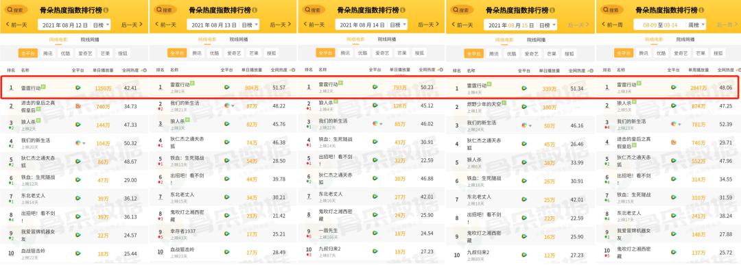 热度方面,《雷霆行动》的骨朵热度指数一度高达51.57;在腾讯视频电影热搜榜上排名TOP1;快手热搜总榜上排名TOP4。