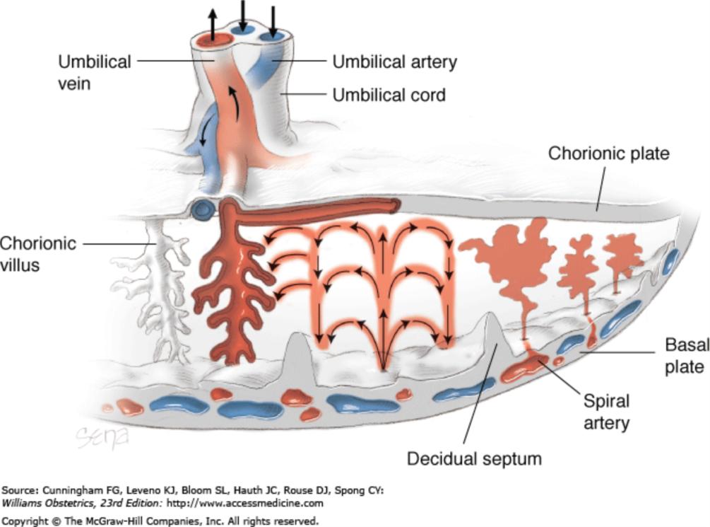 子宫螺旋动脉伸入子宫内膜的功能层,其管径受卵巢激素水平的影响而变化,妊娠后的子宫螺旋动脉将发生一系列生理变化以适应胚胎生长发育的需要,螺旋动脉将富含氧和营养物质的母血送至绒毛间隙,胚胎的发育依赖于子宫动脉的血流灌注。