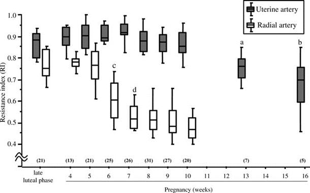 -- Tamura H, et al.Different changes in resistance index between uterine artery and uterine radial artery during early pregnancy. Human Reproduction. 2008.23:285–289--Prefumo F, Sebire NJ, Thilaganathan B. Decreased endovascular trophoblast invasion in first trimester pregnancies with high-re-sistance uterine artery Doppler indices. Hum Reprod,2004,19(1):206-209.