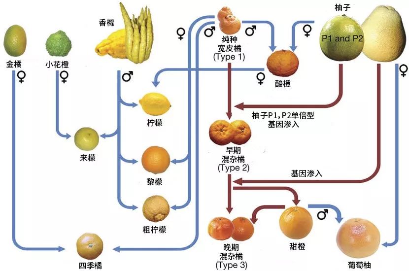 柑橘类水果大部分都来自三大野生种长老:宽皮橘(Citrus reticulata)、柚(C.maxima)和香橼(Citrus medica),在它们的基础上,加上一点点人类的丰富想象力,就造就了现在异常庞大的柑橘类水果大家族。这个家族内关系可谓混乱之极,各种婚生子、私生子层出不穷,导致非专业人士根本搞不清楚它们之间的区别。