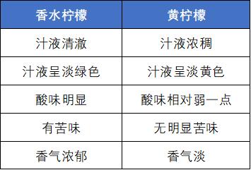 整体来说,香水柠檬的汁液更清澈,呈淡绿色,酸味非常明显且有苦味,整体柠檬香气非常浓郁;而黄柠檬的汁液更浓稠,呈淡黄色,酸味相对弱一些,并且没有明显苦味,整体的柠檬香气淡。