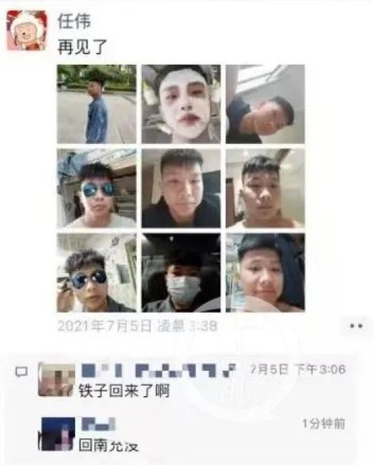 家人称,任伟最后出现在监控画面中,是7月5日凌晨2点半左右。凌晨3点半左右,任伟给母亲发了520元红包,并在微信朋友圈发了9张自拍图,附文“再见了”。