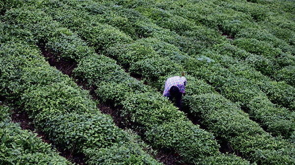 河南省信阳市浉河区浉河港镇,茶农在茶田中劳作。 吴雨晴 摄