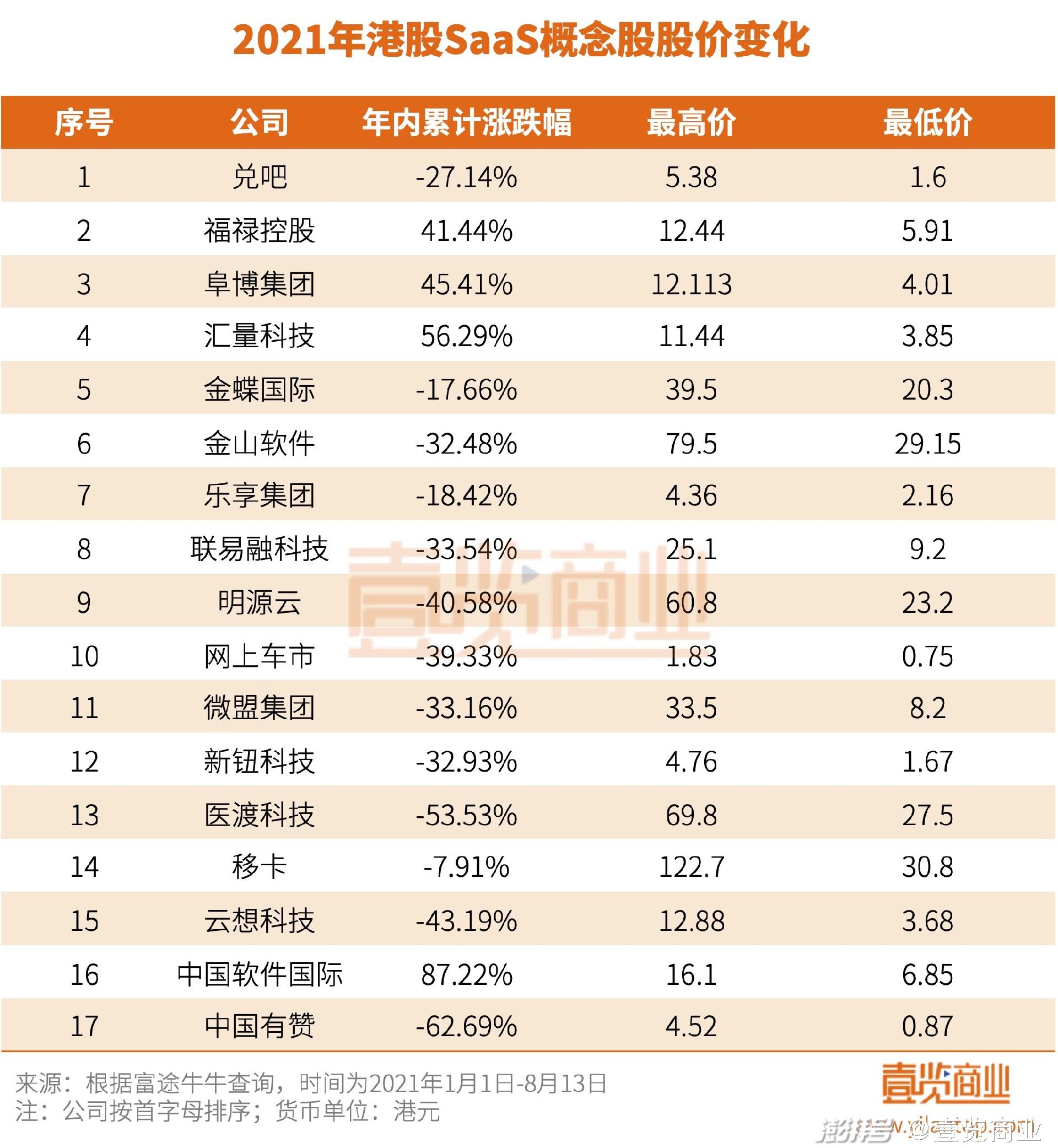 截至8月13日,17只相关成分股中,仅有中软国际、汇量科技、阜博集团和福禄控股四只仍处于上涨。累计跌幅最高的是中国有赞,达62.69%,并且有赞也是波动最大的一只,年内最低价比最高价跌去了惊人的80.75%。波动次于有赞的是微盟集团,最低价比最高价跌去了75.72%。