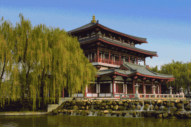 各位游客,接下来我们前往九龙宫景区,这里属华清池西区。波光粼粼的九龙湖对面就是《长恨歌》里的长生殿,“七月七日长生殿,夜半无人私语时。在天愿作比翼鸟,在地愿为连理枝。”这些脍炙人口的名句描写的就是发生在这里的故事。