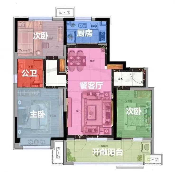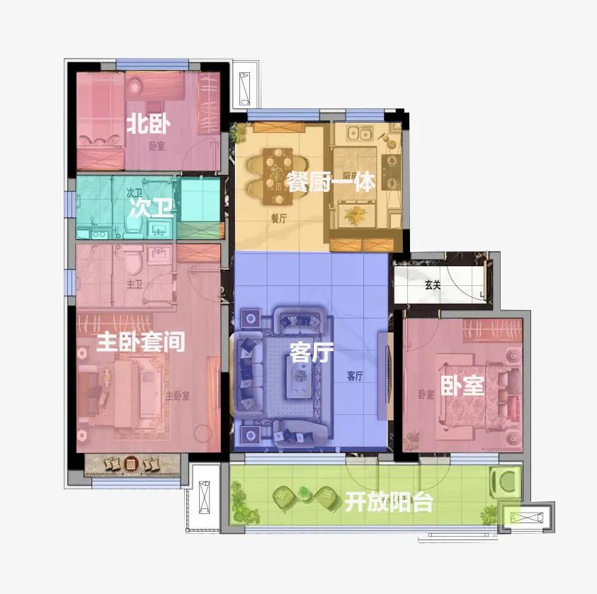 建面约125㎡的三居室,对于首次置业优先选择功能齐全、全明通透的三房户型,再合适不过了。户型不仅节省后期置换成本,也完全满足一家人共同生活的需求。