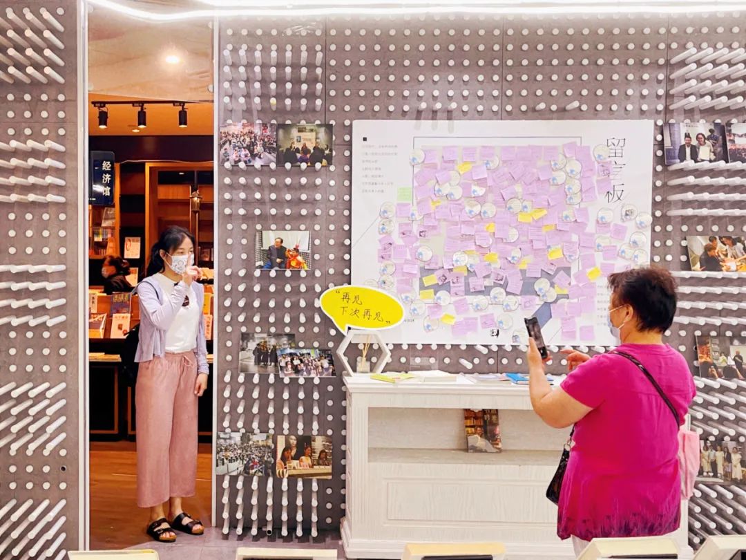 小克勒赶在书店的最后一天走进了书店,书架上的书已经撤下了四五成,平日搞活动的空间里堆满了打了包的书,结账买书的读者排着队等着敲上一枚纪念章,咖啡店里可选择的咖啡和点心已经很少了,但并不影响人们手捧纸杯坐在座位上读书,书店里的人流明显增多,各个角落都有打卡拍照的读者。书店里的留言板上写满密密麻麻的留恋。