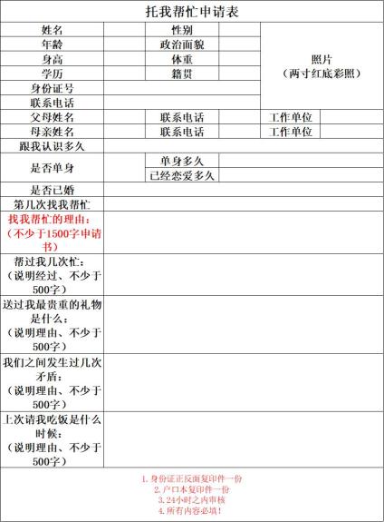 最后附赠一张自制最全《托我帮忙申请表》,后台回复“拒绝”即可获得!如果还有人有求于你,你就让TA填完表格再来: