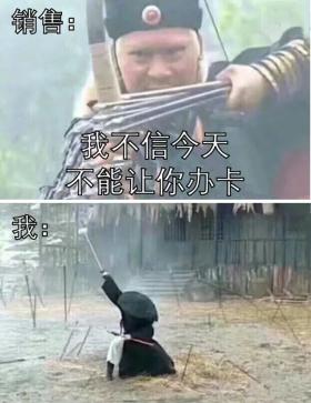 短短一句话,体现了恶劣的现实情况与你旺盛的求生意识之间的矛盾,简直是听者伤心闻者落泪。这时候你求他卖给你,他都不会卖的。同理,遇上卖理发卡的,你就说自己没头发,头上的是假发。让你学英语的,你就说I can't speak Chinese. Can you speak English?对方问你要不要参加成人自考,你就说我在清华读博。我倒要看看,有谁能从智慧的你这里赚走一分钱!