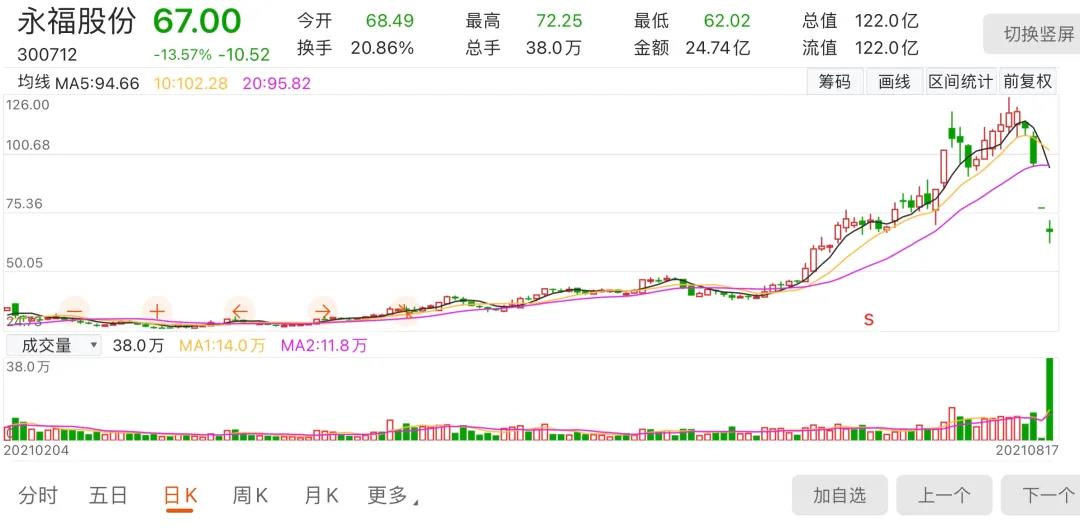 8月16日至17日,永福股份接连跌停,4个交易日跌幅超47%,相较于8月10日最高点126元/股,目前67元/股的股价接近腰斩。