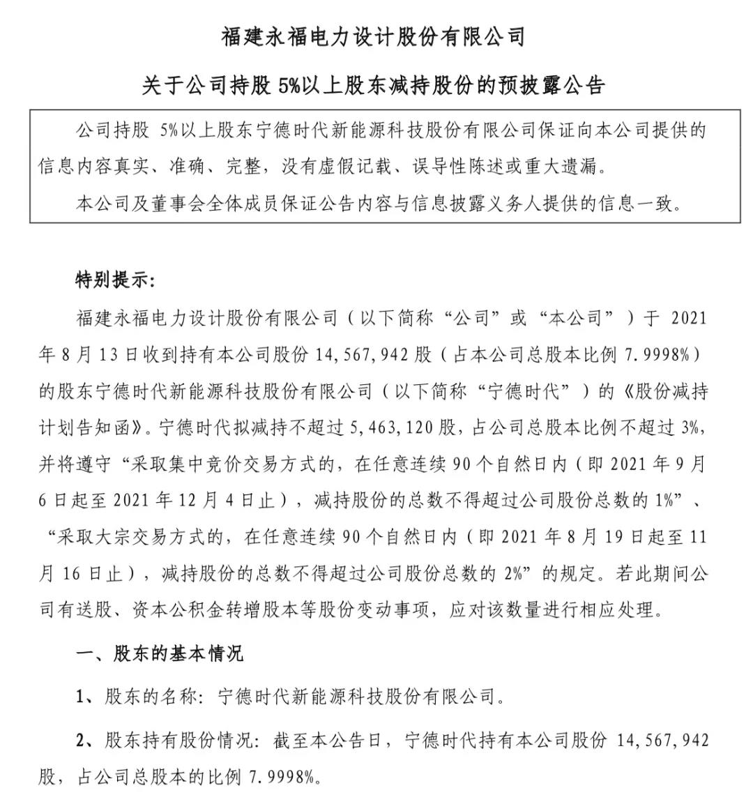 近几日的大跌,完全是因为宁德时代的一份减持公告。8月13日晚间,永福股份公告称,公司股东宁德时代因自身资金需求,拟通过大宗交易、集中竞价方式,减持公司不超过546.31万股,占公司总股本比例不超过3%。
