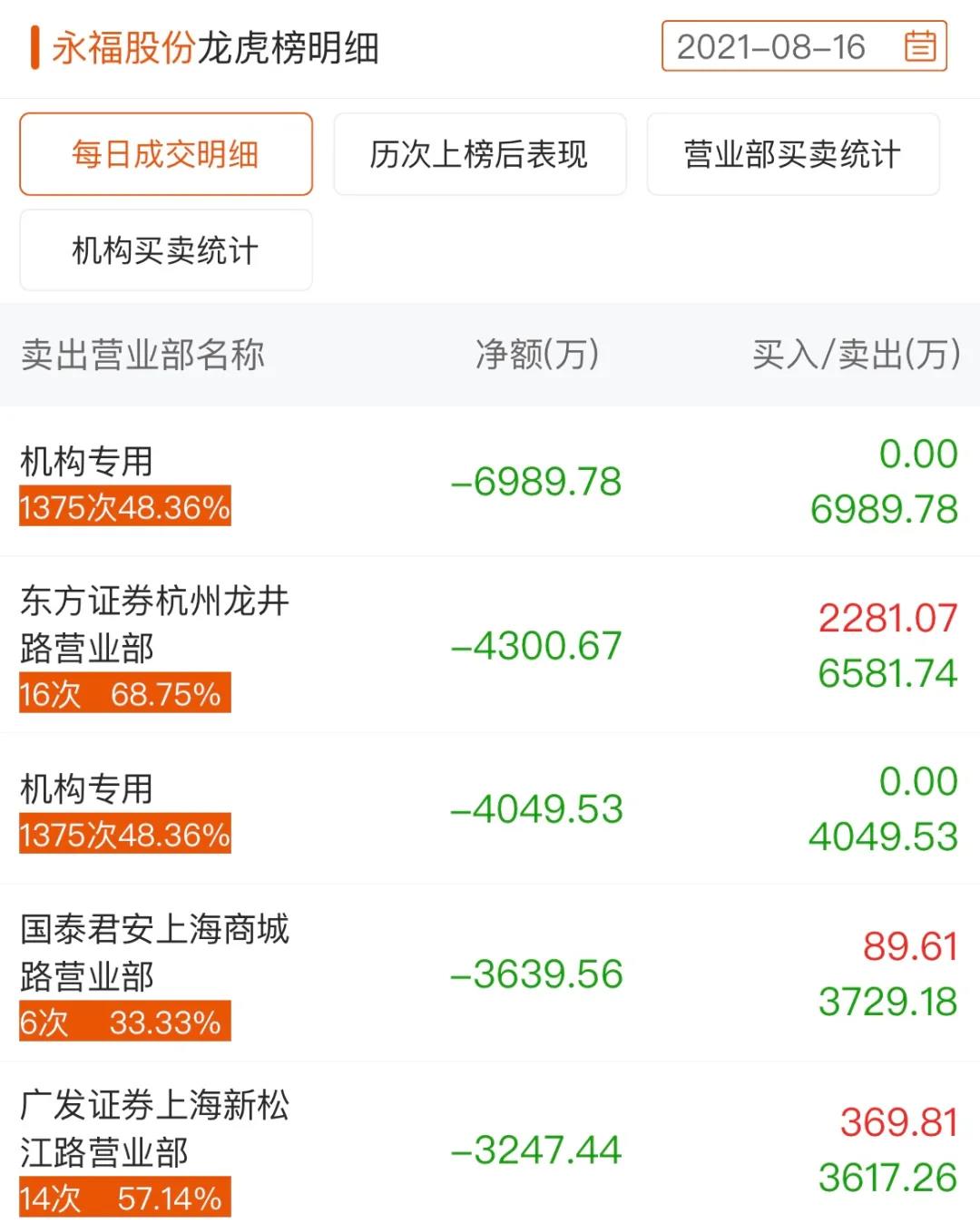 而在曝出宁德时代减持消息的前一晚,即8月12日开始,永福股份股价一路走低,8月16日一字跌停。根据当日龙虎榜,此前三日内,该股共卖出2.88亿元,机构专用席位上榜卖一和卖三,分别净卖出6989.78万元和4049.53万元。