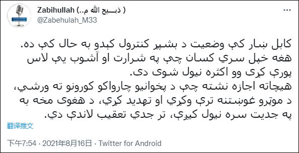 保护民众私有财产8月15日,阿塔发言人沙欣发布推文表示,塔利班对于任何人的私有财产(包括汽车、土地、房屋、商店)都不感兴趣,而是将保护国家民众的生命和财产安全是为首要责任。