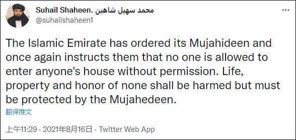 16日,沙欣再次发推强调,塔利班已经下令所有“圣战者”,未经允许不得进入任何人的房屋内。“只要在‘圣战者’的保护下,任何人的生命、财产和荣誉都不会受到伤害。”