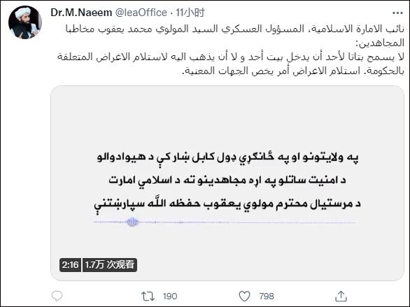 当天晚上,阿塔政治办公室发言人穆罕默德·纳伊姆在推特发布了一则来自一名阿塔军事官员的音频。该官员告诉所有塔利班成员,不得进入任何人的房屋内。
