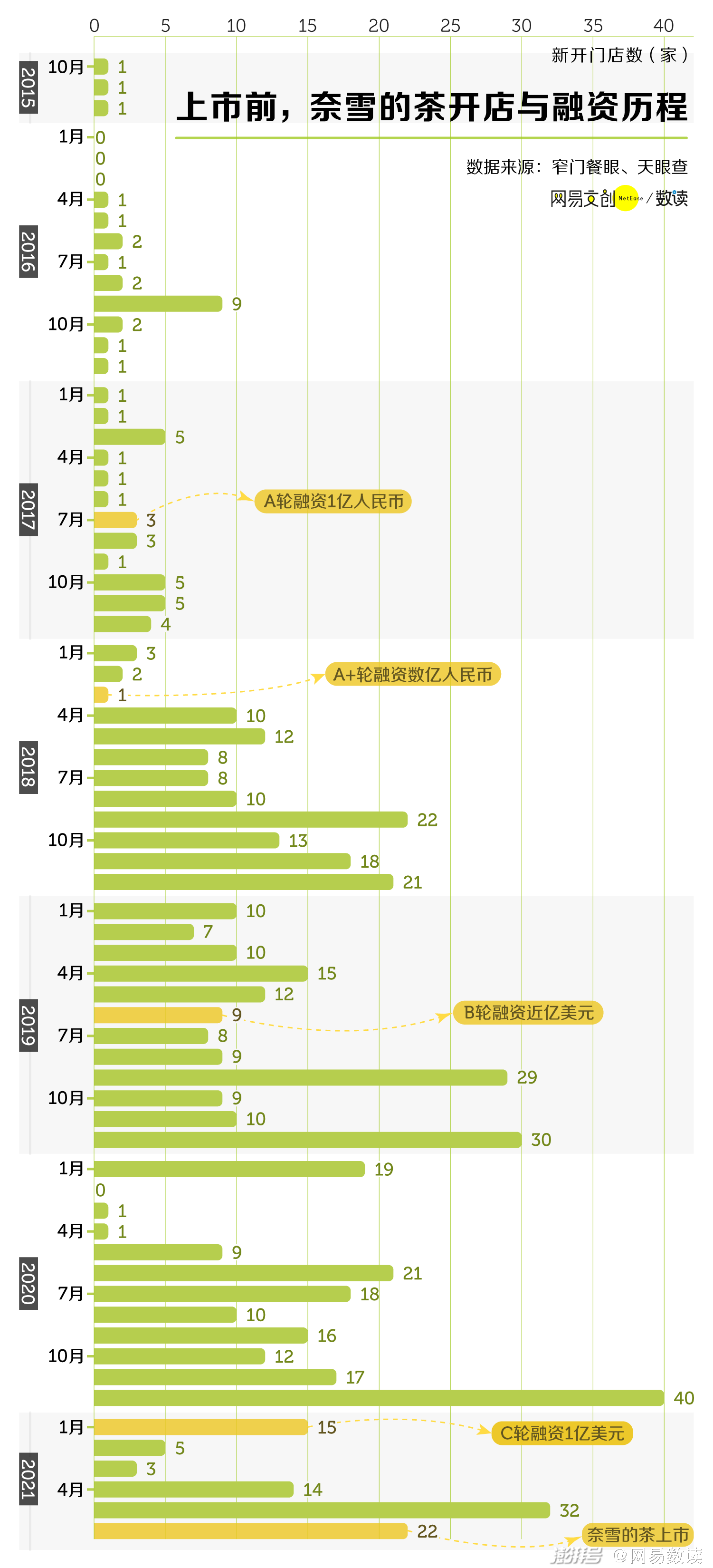 时间轴拉近一点,2021 年 6 月,新式茶饮的头部品牌奈雪的茶在港交所上市,成为新式茶饮第一股。奈雪的发展历程就再一次证明了餐饮品牌也可以走通融资、扩张、上市的路。