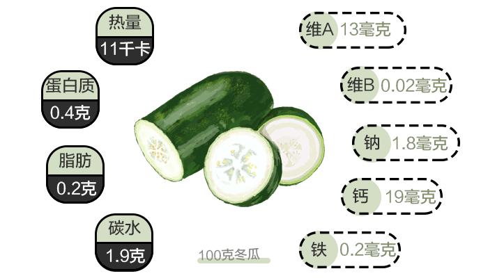 冬瓜的蛋白质、维生素以及矿物质含量比较丰富;营养益处:具有防治癌症效果的B族维生素,在冬瓜籽中含量相当丰富。除此之外,冬瓜的膳食纤维含量很高,每100g中含水溶性膳食纤维约0.7g,饱腹感强的同时还可以刺激肠道蠕动,促进排便。
