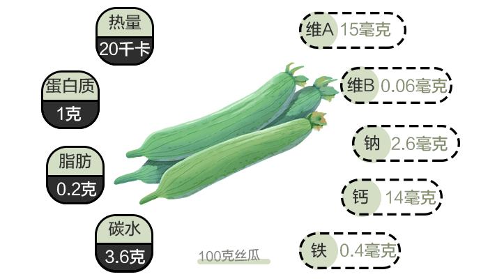 丝瓜的含水量也不低,含水量达到94%,每100克丝瓜中蛋白质含量为1克,碳水化合物为4.2克,脂肪含量为0.2克;营养益处:属于低脂低热量的蔬菜,非常适合减肥人群和三高人群食用;另外丝瓜中的胡萝卜素含量也不低,每100克可使用部分含有90微克的胡萝卜素,有一定的保护视力和皮肤的效果。