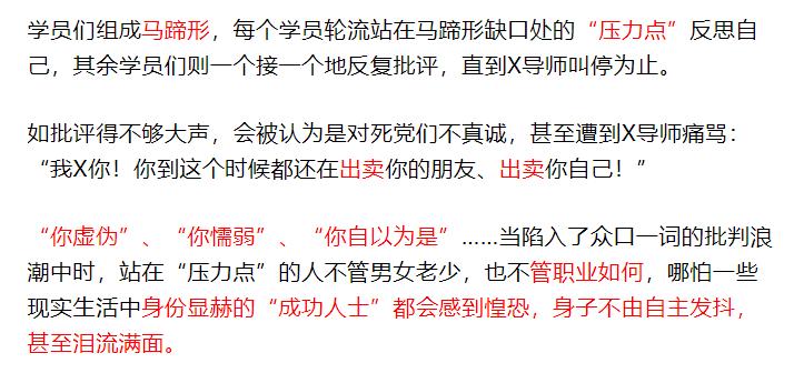 曾在2007年亲自卧底过精神控制课程的李亚玲,昨天又撰文把当时“挨骂”的恐怖细节还原了一遍: