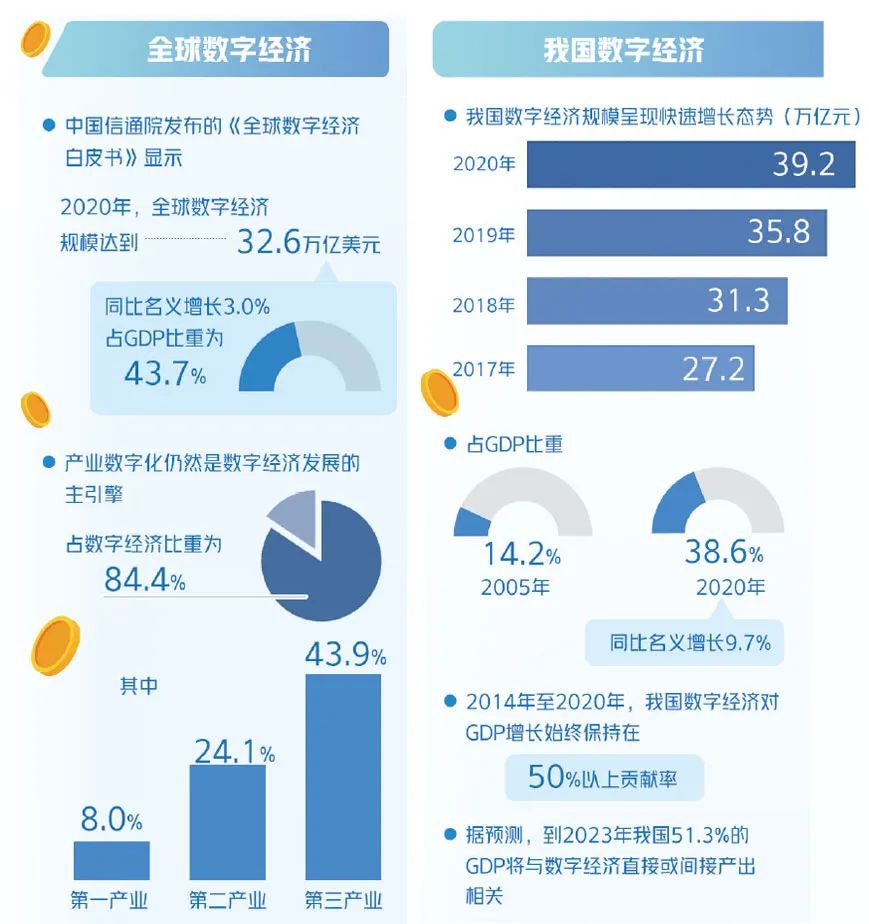2014年至2020年,我国数字经济对GDP增长始终保持在50%以上贡献率,成为驱动经济增长的核心关键力量。据预测,到2023年我国51.3%的GDP将与数字经济直接或间接产出相关。