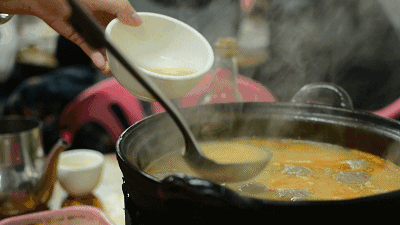 酸辣的火锅里加入海鲜、海菜、鸡肉、牛肉、牛腩、鸭肠等各式火锅食材和菜蔬,酸辣的糟粕醋混合海菜和海鲜的脆爽,涮起来!