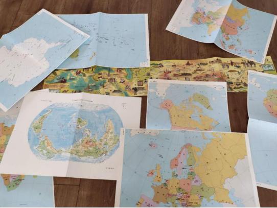 世界地形图,各个大洲的政区图,还有丝绸之路的手绘路线图。
