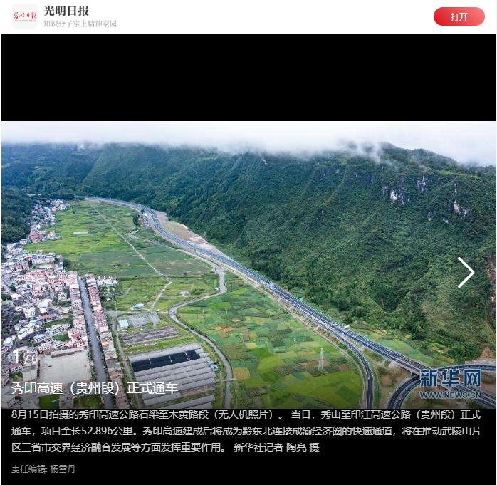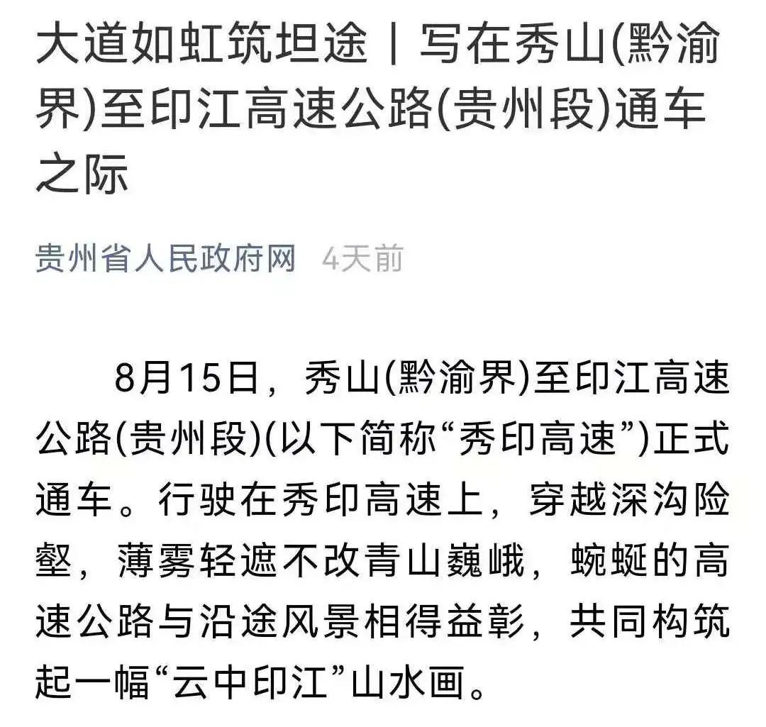 秀印高速通车的新闻获得社会各界的广泛关注。截至目前,已有包括国务院客户端、贵州省人民政府、新华社、经济日报在内的超100家政府机构、重点媒体对该事件进行报道,受众覆盖面超1000万人次。政府关注
