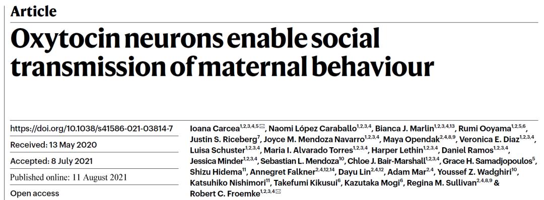 近日,纽约大学格罗斯曼医学院的研究人员在国际顶尖学术期刊 Nature 上发表了题为:Oxytocin neurons enable social transmission of maternal behaviour(催产素神经元使母性行为的社会传播成为可能)的研究论文。