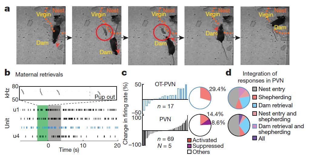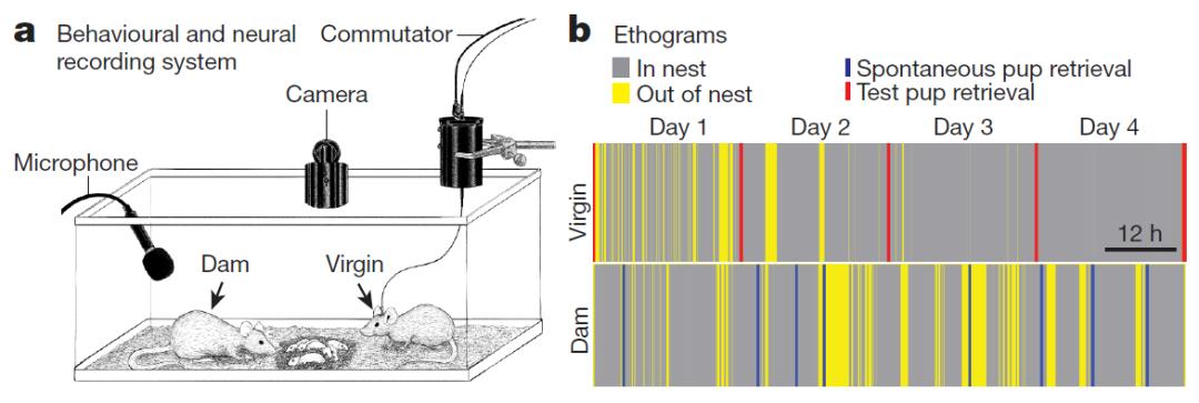 社会互动,如结成配偶和抚养孩子,是动物和人类行为的基本方面。亲代抚育尤其重要,因此被认为至少部分是天生的或在交配后诱导的。当然,母性行为也可以从经验中习得。例如,在包括人类在内的灵长类动物中,无育幼经验的个体可以通过观察经验丰富者而学会如何照顾孩子。催产素是母性行为的重要分子信号,在哺乳动物中,下丘脑室旁核(PVN)释放的催产素与分娩和哺乳有关。此外,催产素还在大脑中起作用,以增加社会信息的显著性,并使小鼠的“异亲养育”成为可能。但遗憾的是,目前还不清楚什么神经机制是母性学习的基础。