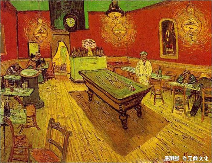 梵高画过阿尔的《夜间咖啡馆》,是色彩极端对比的红色的墙、绿色的弹子台、黄色的灯光,有一种陷入精神高度亢奋的错乱。这是梵高走向梦想的巅峰,也是梵高走向毁灭的开始。他已经开始用燃烧自己的光和热来维持自己对艺术的狂热。