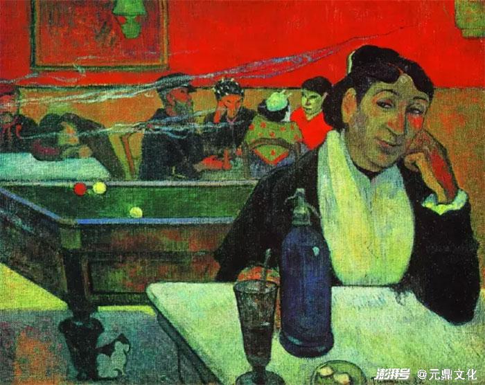 高更同样画了《夜间咖啡馆》,他以咖啡屋老板娘“吉诺夫人”为主题前景,也用到墙壁的红、弹子台的绿,但是色彩被一种黑色压暗,和梵高画中强烈的对比不同,高更的画面有一种深沉的冷静,他好像要刻意过滤掉梵高画中过度高昂的情绪。