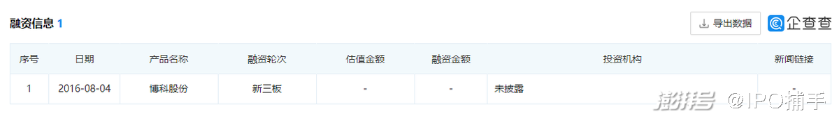 据企查查信息显示,迄今为止博科测试共拿到了1轮融资,该轮融资为2016年8月4日新三板上市融资,具体融资金额与投资机构尚未公布。