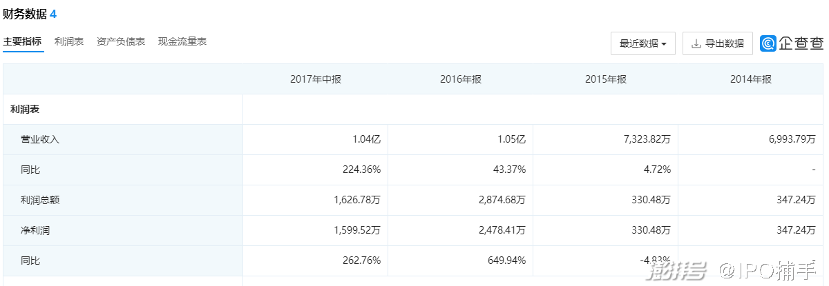 财务数据层面,据企查查显示,2017年该公司营收1.04亿元,同比增长224.36%;净利润为1599.52万元,同比增长262.76%。