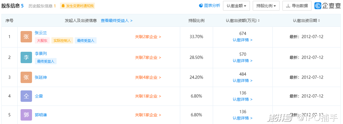从股权结构来看,张云兰是公司的最大股东和实际控制人,持股33.7%;其次,李景列持股28.5%,张延伸持股24.2%。