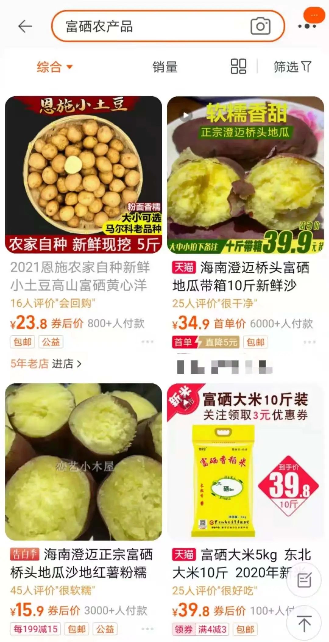 《中国食品安全网》记者在购物平台搜索“富硒农产品”,可以看到湖北恩施小土豆、海南澄迈桥头富硒地瓜、安徽池州富硒大米等在优先推荐位置。就该电商平台的销售价格而言,带有“富硒”字样的农产品普遍比市场价格高出一截。