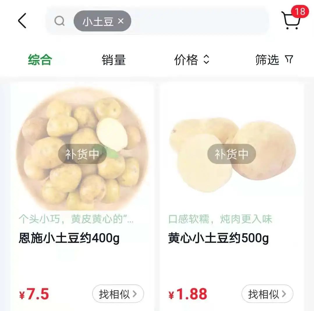 图片来源:搜索截图在某团购网站搜索“小土豆”字样,标称“恩施小土豆”的商品(下图左)为每400g7.5元,即500g/9.38元,一般小土豆(下图右)的价格为500g/1.88元,“恩施小土豆”的价格约为一般小土豆价格的5倍。