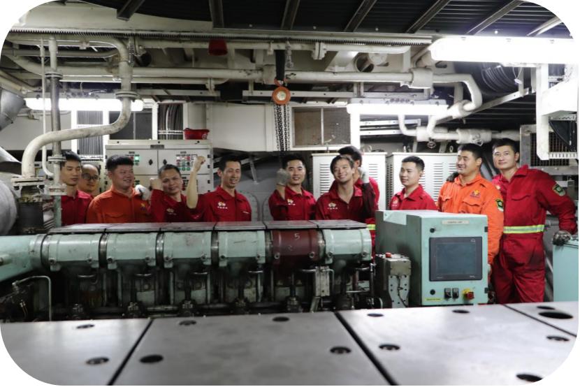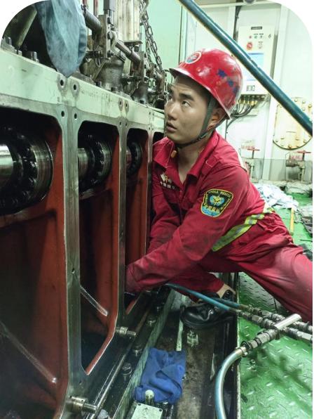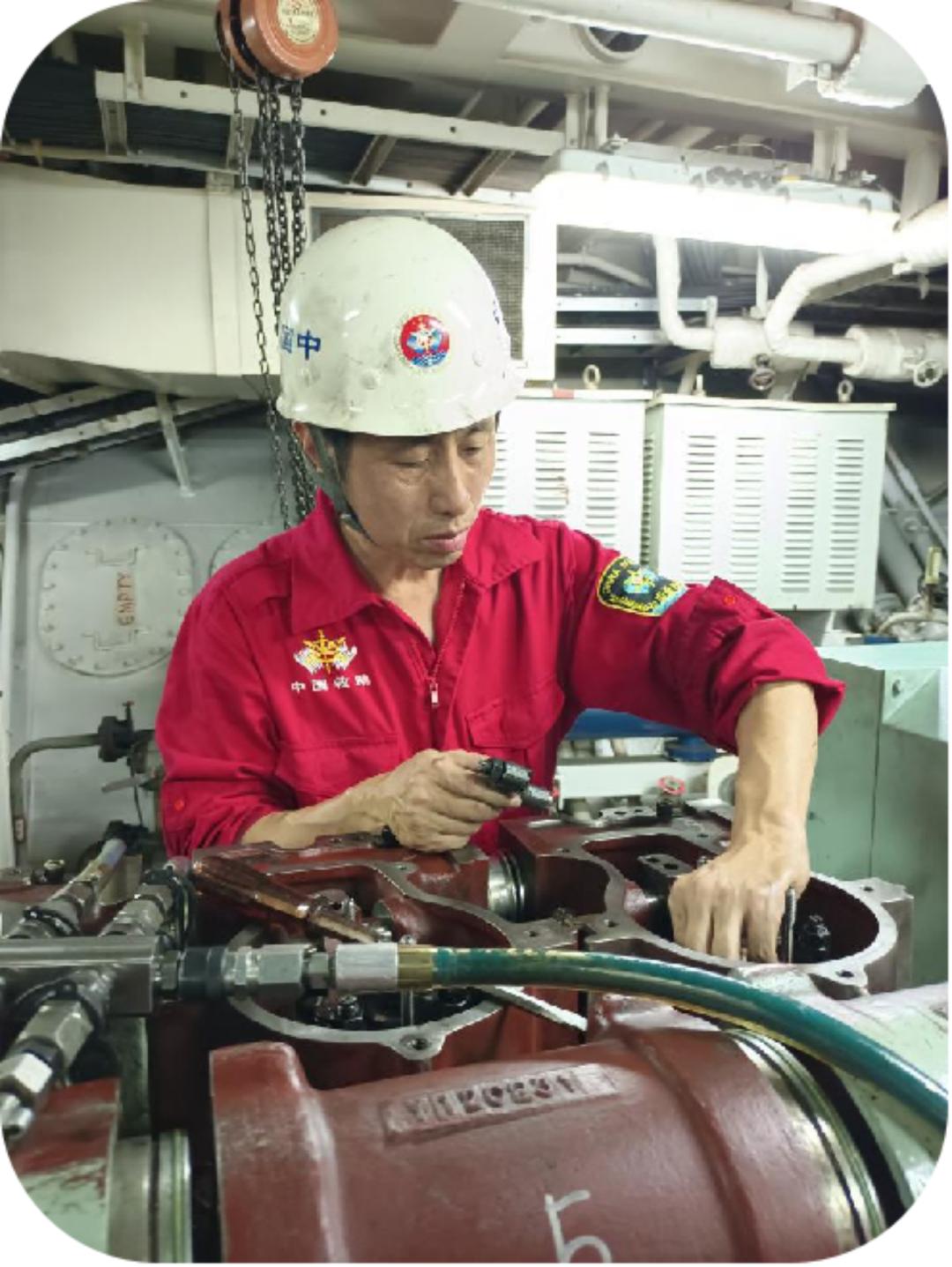 说起轮机长刘永清大家耳熟能详,他曾多次参与支援扩大自修工程,尤其是在“液压胶管扣压技术”上颇有造诣。由于专业技术过硬,经验丰富,大家习惯叫他“清工”。“清工”性格比较开朗,善于交谈,每次见到他时脸上都洋溢着笑容,显得十分自信、和蔼,个头虽然不高,但总能看到他忙碌的身影穿梭在机舱,或是站在机旁指导大家巧妙地拆装贯穿螺栓螺母,亦或出没于机修间,手把手地教管轮调试油头……除了做好修理工作,他还喜欢对修理过程进行总结,形成一套具有指导意义的课件方便大家日后学习研讨,他是当之无愧的技术总监!·动作指导 / 吴剑