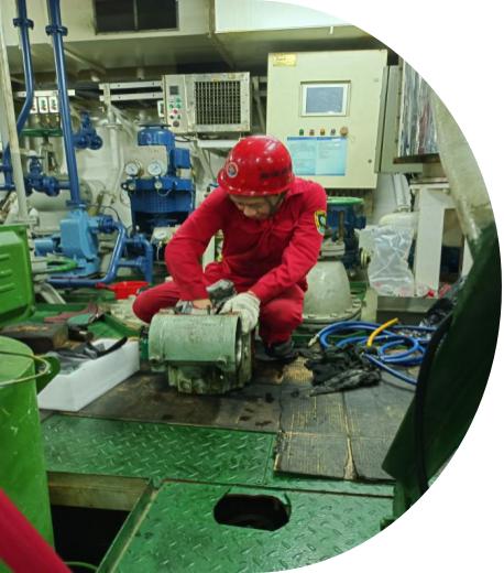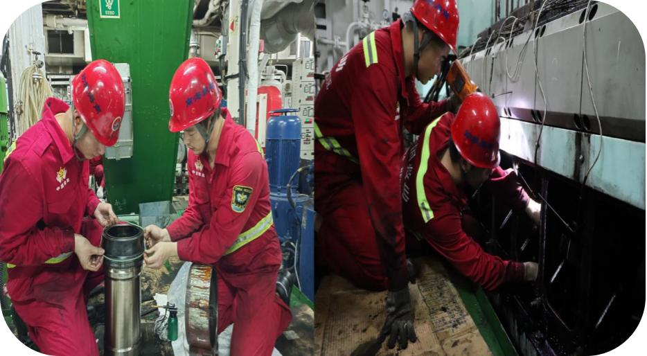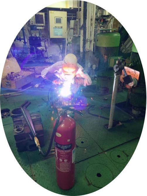我们所谓的“南哥”不是金庸小说里义薄云天的大英雄陈近南,也不是古惑仔里有情有义的洪兴大哥陈浩南,他是一位有着十多年丰富工作经验的“老”机工——吴宣楠,平日里我们习惯叫他“南哥”。十多年的钻研和积淀让他在烧焊、金工工艺上颇有造诣。这回拆装气阀阀座,他凭借着精湛的技艺,量尺寸、割圆铁,并将小圆铁完美地焊接在阀座上,借巧力将卡紧的阀座敲出,解决了一项技术难题,让轮机部的兄弟们少走了弯路,节省了大量的时间,提高了大修工作效率。就连李老轨也情不自禁地称赞道“机舱有‘南哥’在,事半功倍,大修的事我放心。”·“副机美容师” / 林立聪、李杰、李国威