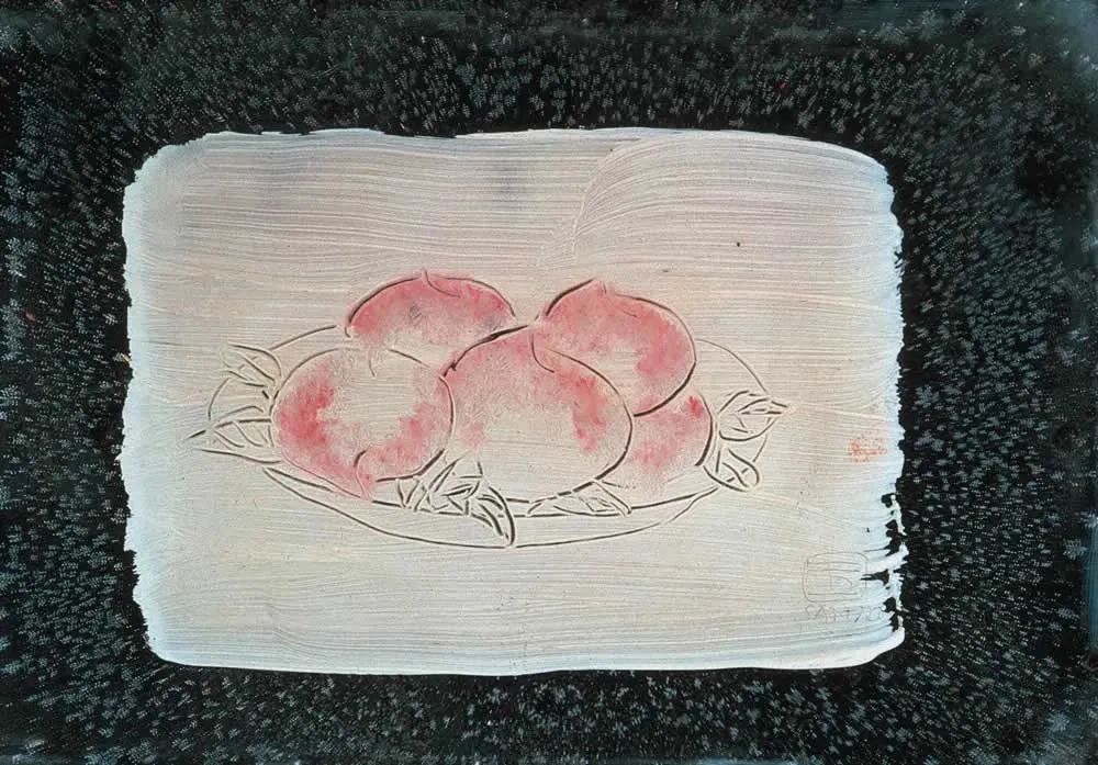 ▲ 常玉画在镜面上的寿桃,他经常选用新颖的媒介作画,比如他使用塑胶板绘画就比毕加索早了十几年。