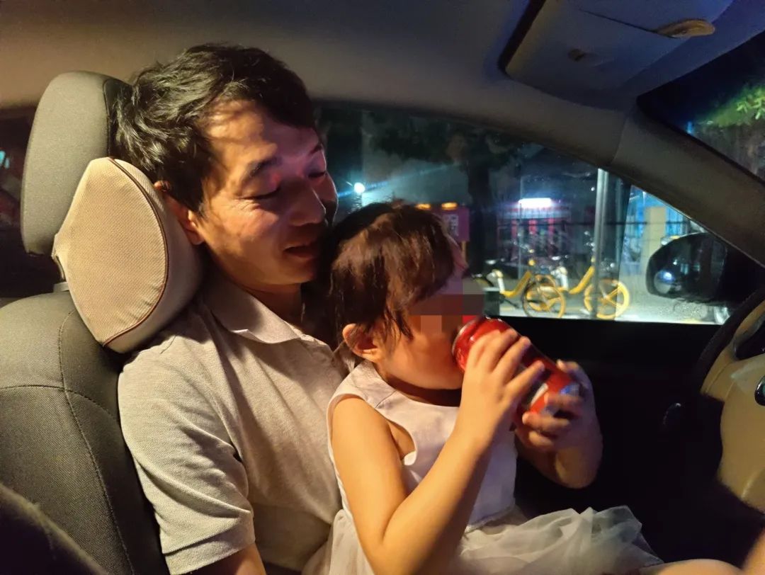 女儿口渴,王友德在车里给女儿备好了饮料